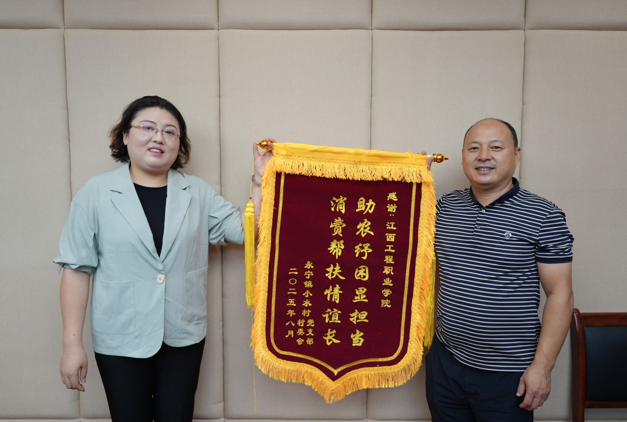 近日,宜春市铜鼓县永宁镇党委委员、副镇长李乔强,小水村党支部书记温小平一行4人来到学校,代表全体村民赠送锦旗,感谢学校五年来对小水村的倾力帮扶。学校党委委员、副校长黎武之出席赠送仪式,学校驻村工作队队员彭帆、颜斌参加仪式。
