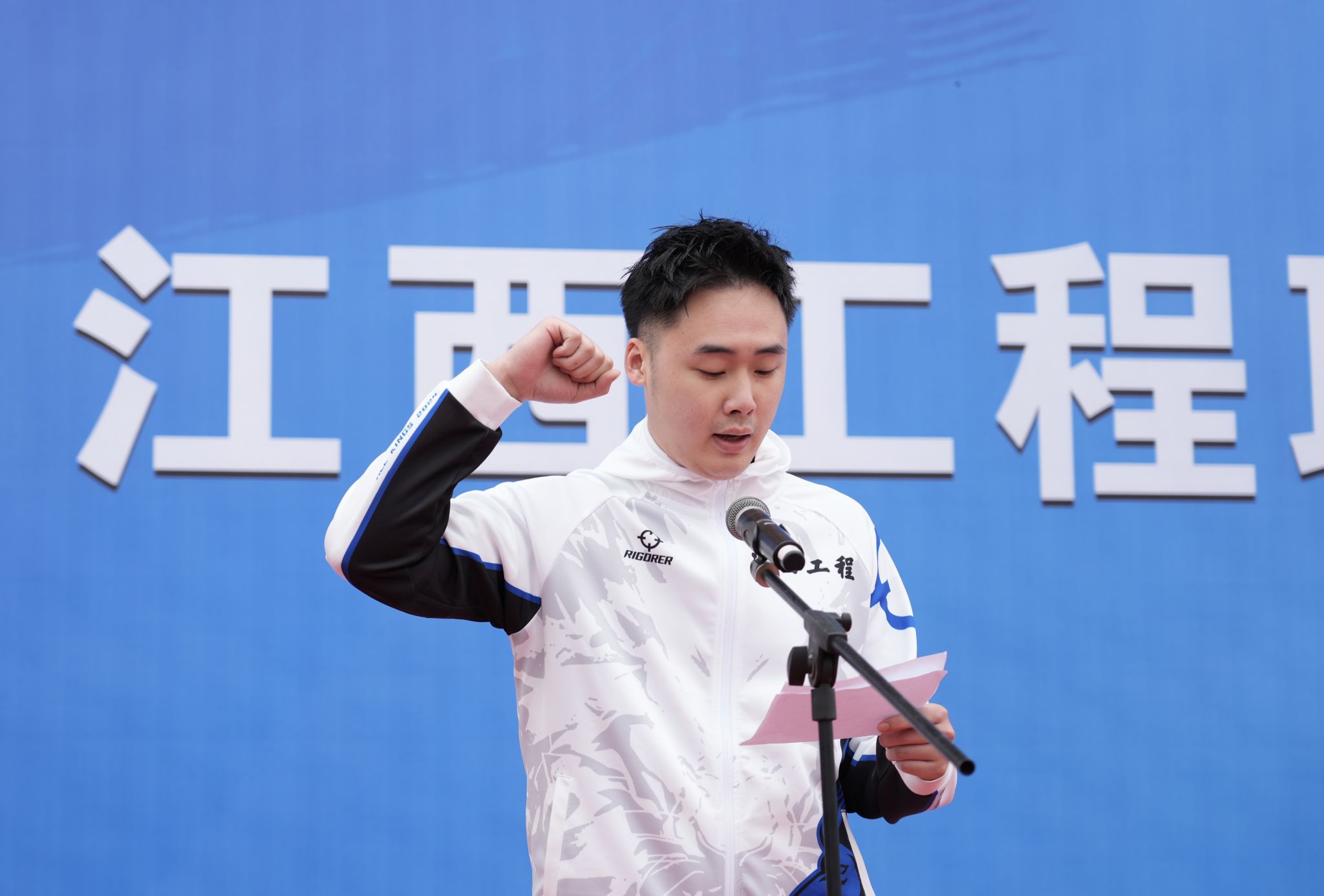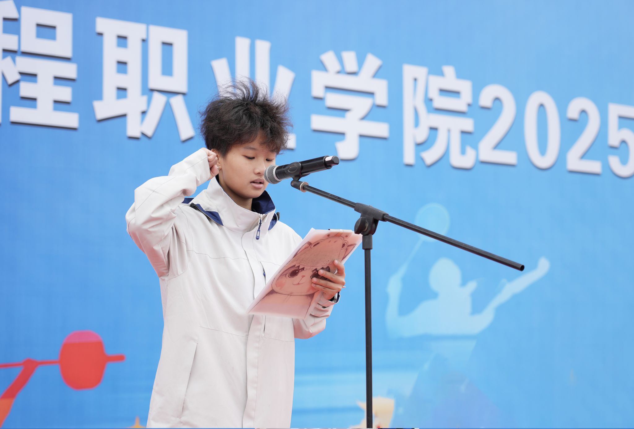 开幕式上,体育老师胡睿、信息工程学院2025级数字媒体技术6班罗紫涵分别代表裁判员、运动员进行了宣誓。