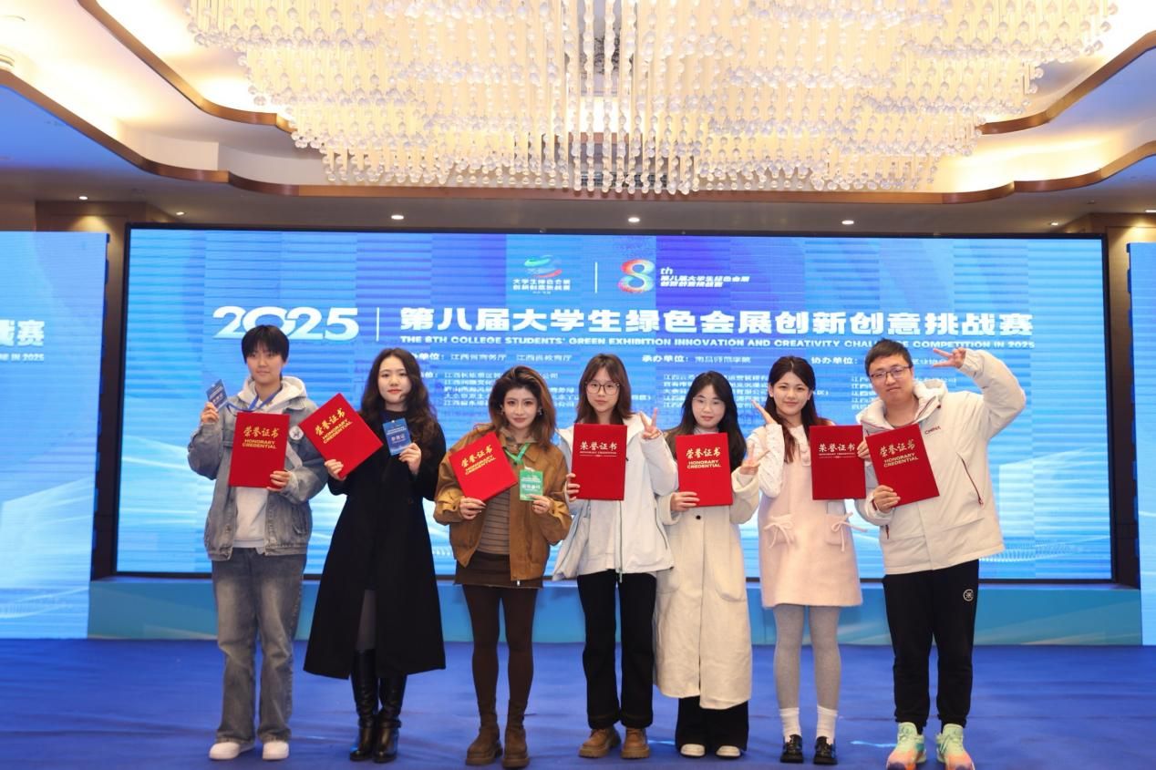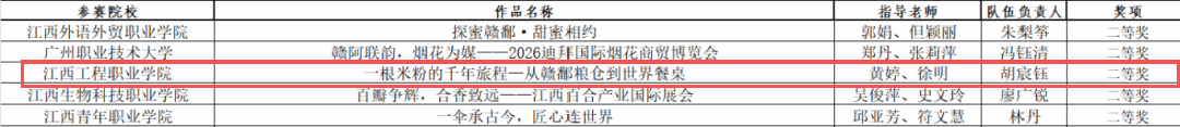 12月14日,由江西省商务厅和江西省教育厅联合主办的第八届大学生绿色会展创新创意挑战赛圆满落下帷幕。学校财经商贸学院“深藏BLUE”团队(小组成员:胡宸钰、俞嘉霖、李菁菁、夏雨歆、欧阳冰,指导老师:黄婷、徐明),凭借作品《一根米粉的千年旅程——从赣鄱粮仓到世界餐桌》,在高职组会展国际推介(英语)赛道中脱颖而出,成功斩获二等奖。