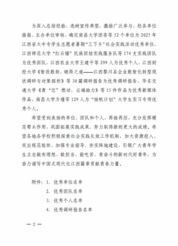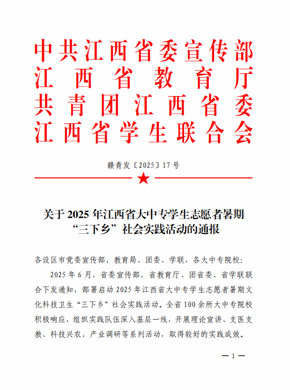 近日,中共江西省委宣传部、江西省教育厅、共青团江西省委、江西省学生联合会联合印发《关于2025年江西省大中专学生志愿者暑期“三下乡”社会实践活动的通报》。学校王培玉、邹琴红老师指导的社会实践团队——“育梦冲锋”队荣获“优秀团队”称号,王培玉老师荣获“优秀个人”称号。