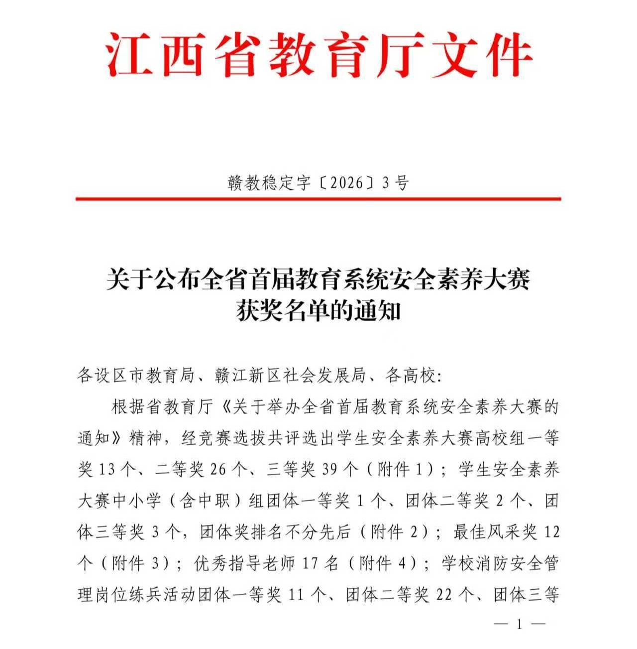本次大赛由江西省教育厅主办,面向全省各设区市教育局、赣江新区社会发展局及各高校,参赛范围广、竞争激烈,是对全省师生安全素养水平的一次系统检验与实战锻炼。吴雨珊同学在此次比赛中展现出的扎实知识储备、良好安全意识与积极进取风貌,充分体现了学校在学生安全素养培育和校园安全文化建设方面取得的扎实成效。