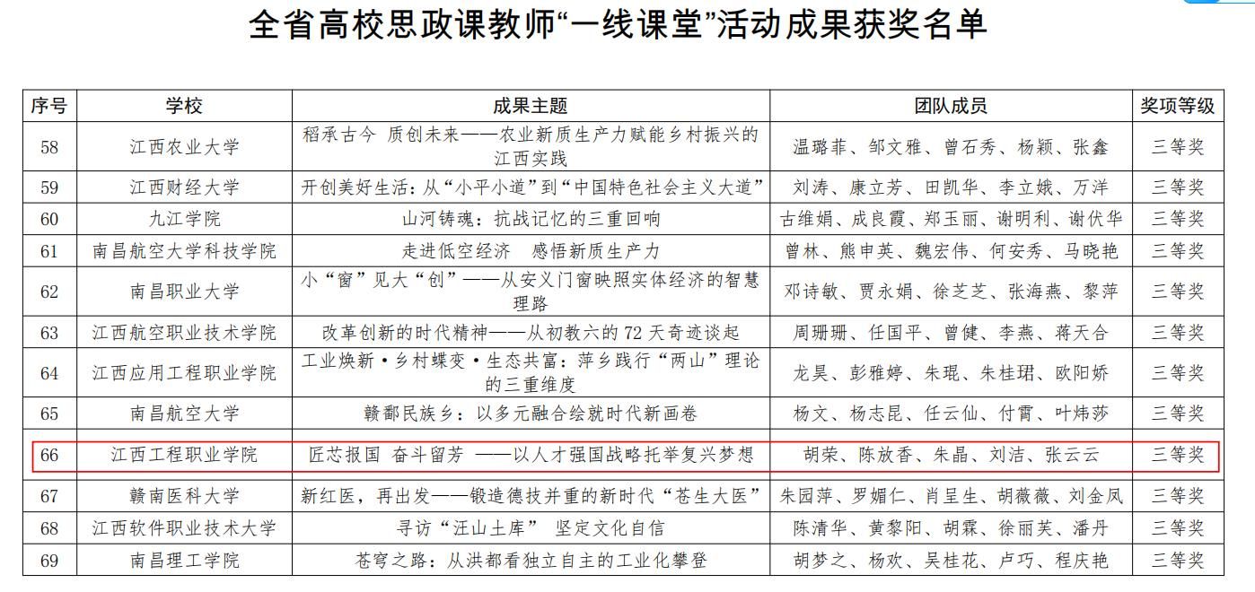 近日,江西省教育厅公布2025年全省高校思政课教师“一线课堂”优秀成果评选结果。经专家评审,在全省各高校推荐的229项活动成果中,共选出73项获奖作品,由我校马克思主义学院胡荣、陈放香、朱晶、刘洁、张云云五位教师精心打造的参赛作品《匠芯报国 奋斗留芳——以人才强国战略托举复兴梦想》荣获三等奖。