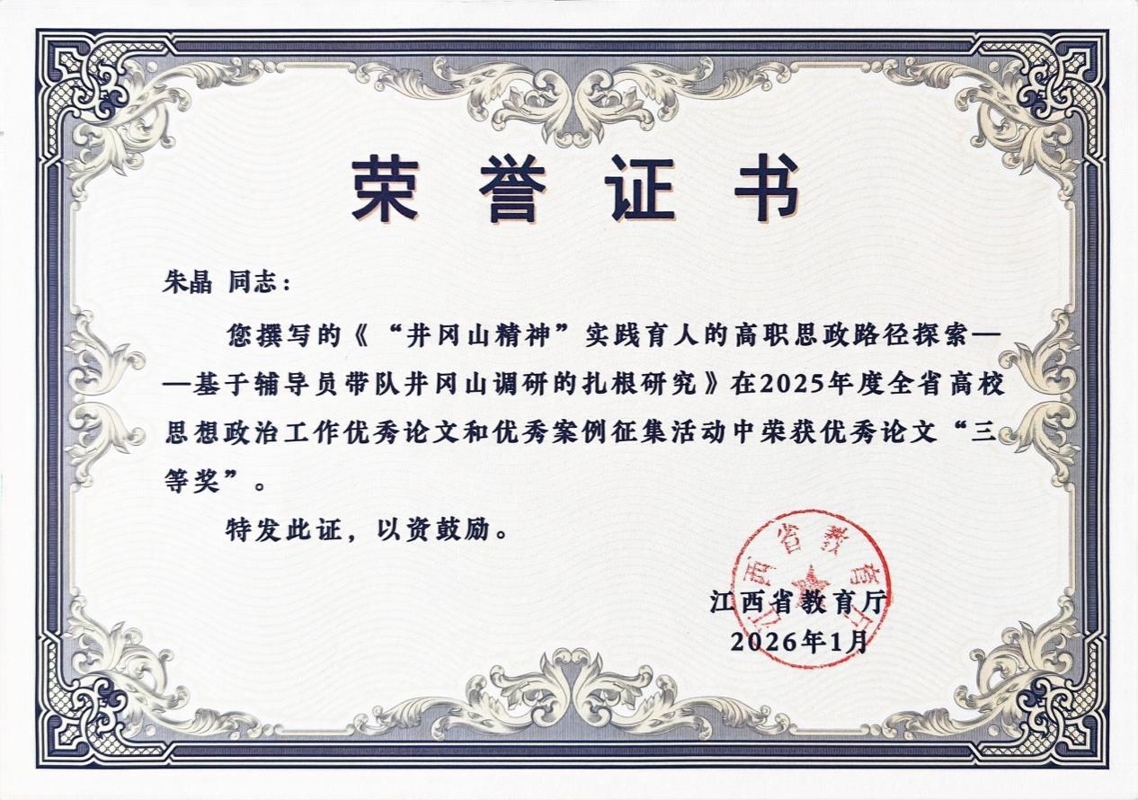 近日,2025年度全省高校思想政治工作优秀论文和优秀案例征集活动评选结果公布,我校马克思主义学院教师朱晶撰写的论文《“井冈山精神”实践育人的高职思政路径探索——基于辅导员带队井冈山调研的扎根研究》斩获优秀论文三等奖。
