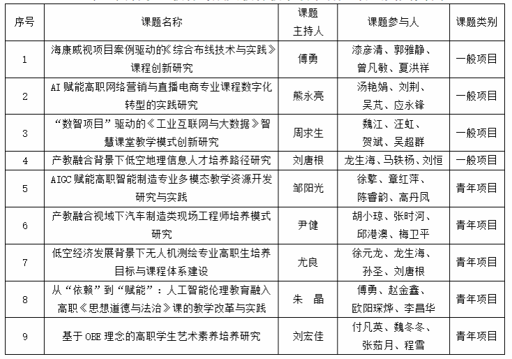 根据江西省教育厅下发的《关于做好2025年度江西省职业教育与成人教育教学改革研究课题申报立项工作的通知》(赣教职成字〔2025〕29号)文件精神,经个人申报、部门审核推荐、组织专家评审,确定《海康威视项目案例驱动的<综合布线技术与实践>课程创新研究》等9项课题拟推荐到江西省教育厅参加省级评审(具体详细见名单),现予以公示。公示时间:2025年11月28日—2025年12月3日。