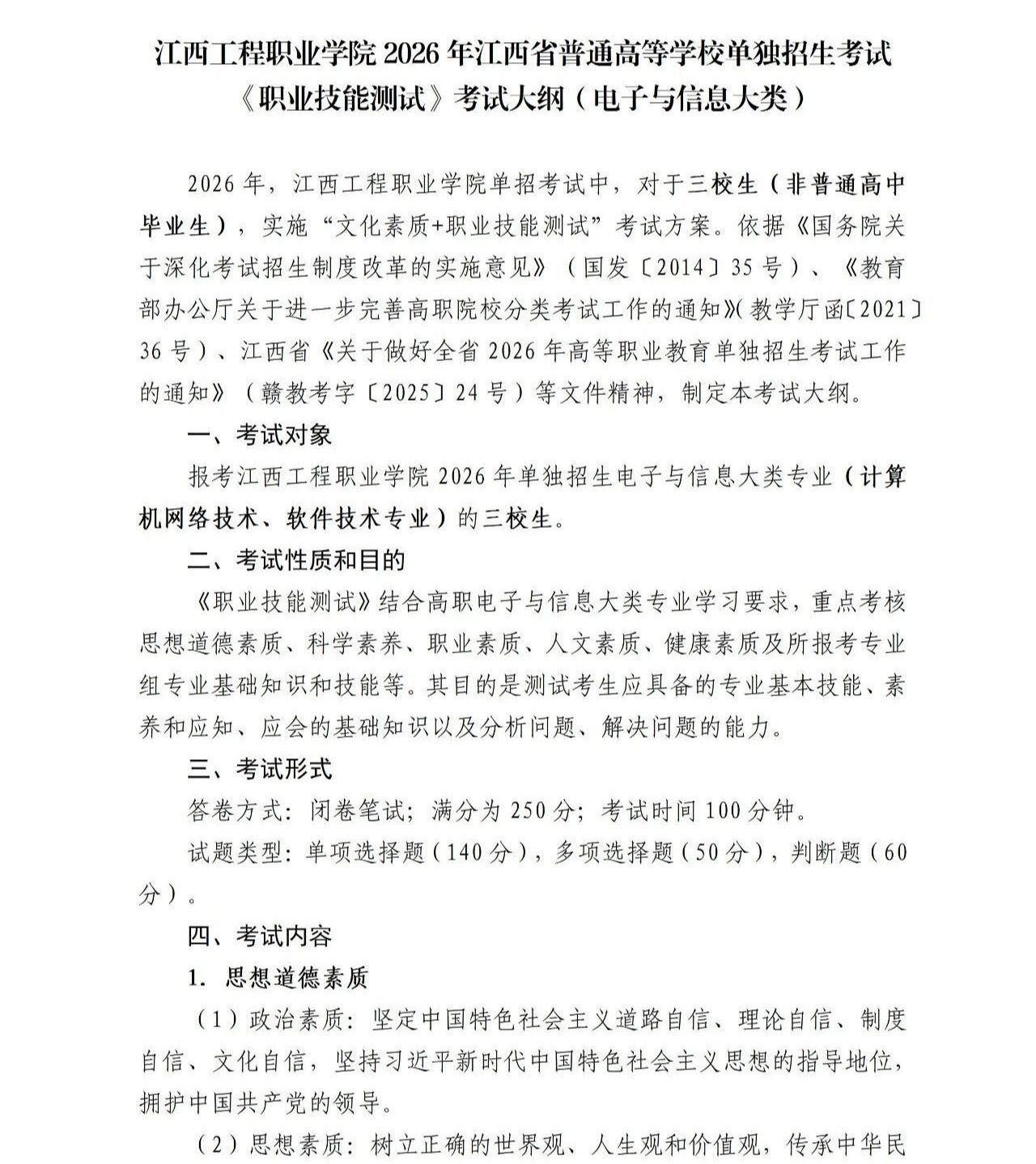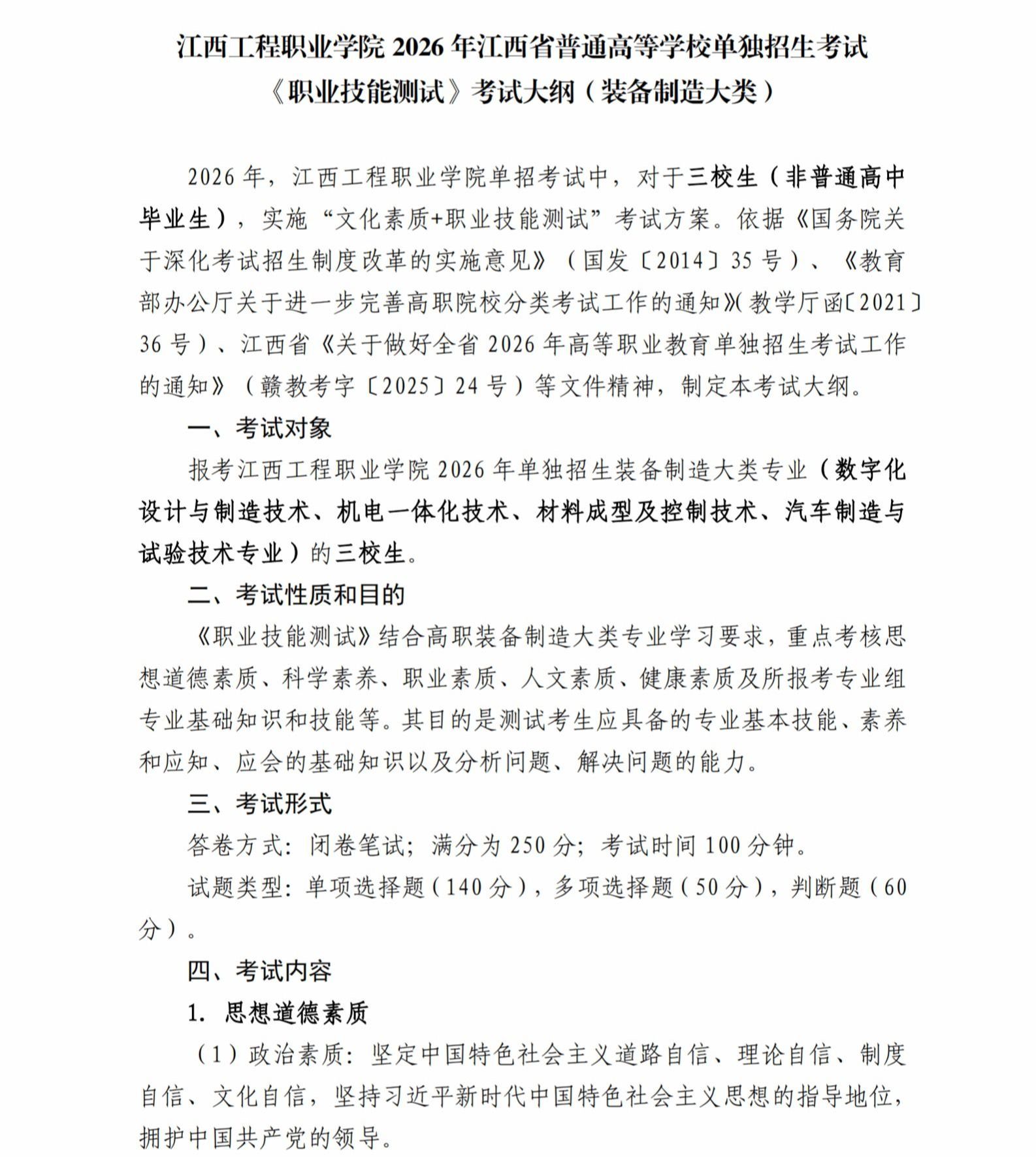 为帮助各位考生高效备考,现正式公布江西工程职业学院2026年单独招生考试大纲,请各位考生根据考试类别仔细查阅对应大纲内容,合理规划复习,做好充足准备。
